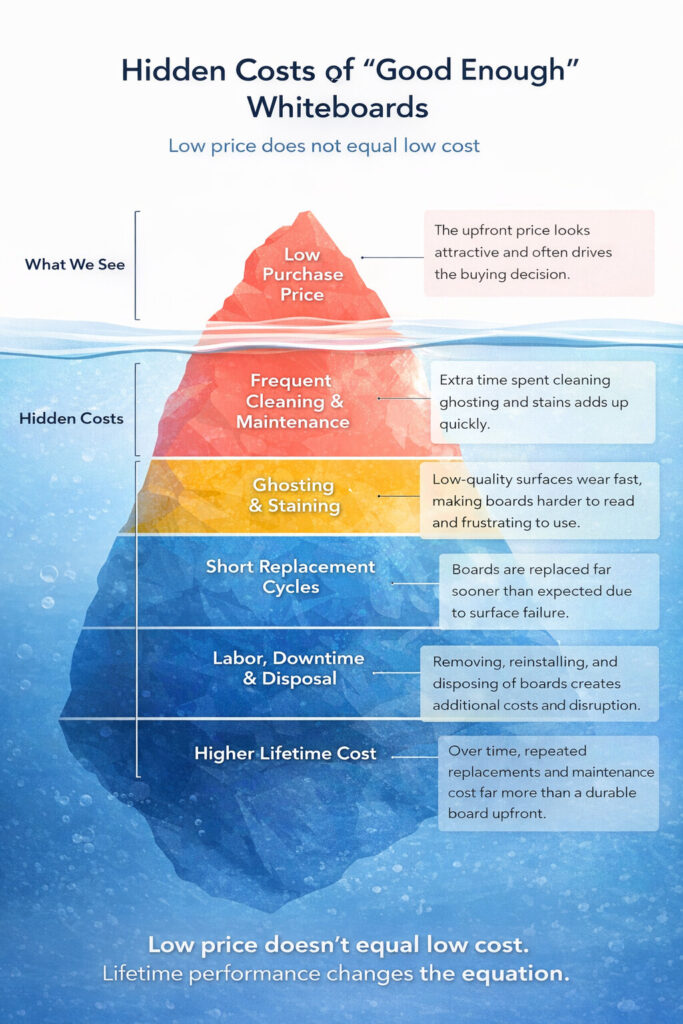 The problem is that what looks affordable at purchase rarely stays that way. Many whiteboards come with hidden costs that don’t show up on the invoice—but show up later in cleaning time, maintenance frustration, and early replacement.