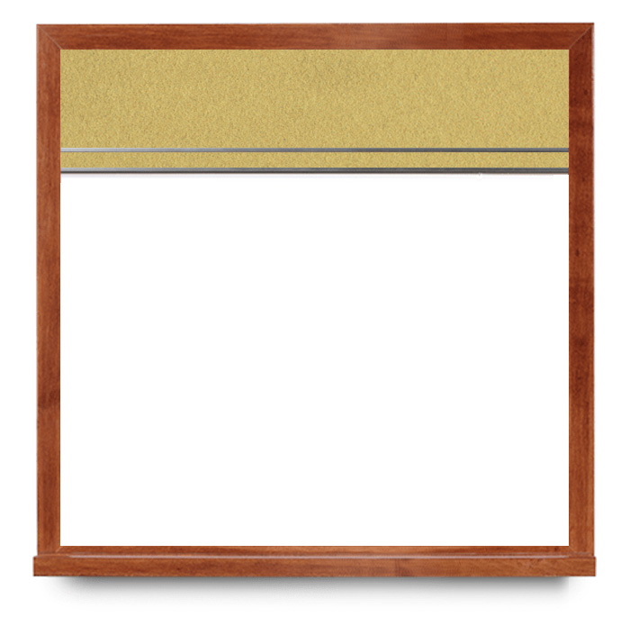 Whiteboards with magnetic dry erase surface and cork panel across top, narrow cherry wood frame. Cork available in 15 colors. These boards are available in sizes 4×4 and 4×6; for bigger boards, see our wide cherry framed boards.