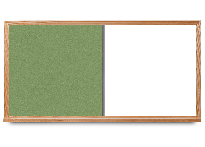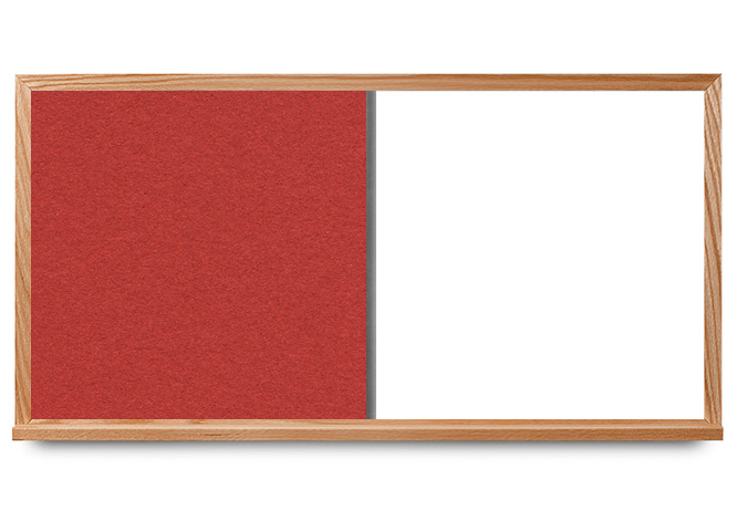 Magnetic dry erase whiteboard surface and cork panel on either side; narrow oak frame. Whiteboard surface will not stain. This narrow wood-framed boards come in sizes 4×4 and 4×6; for wider sizes, see the wide oak frame magnetic board.
