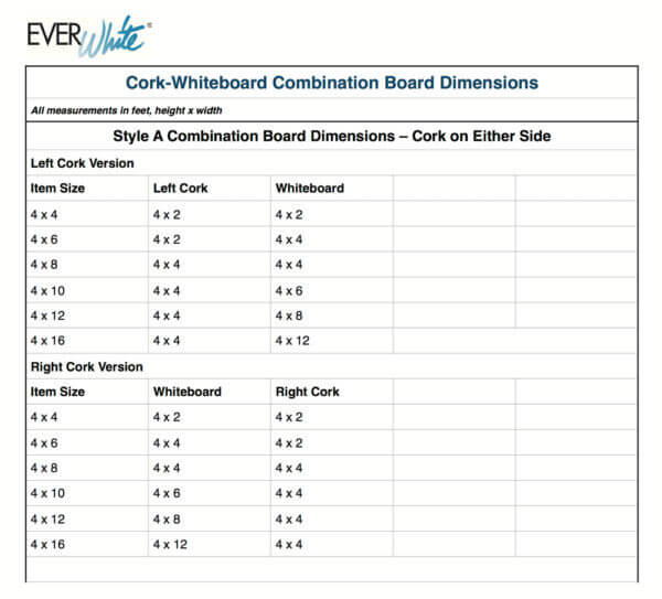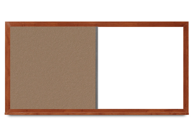 Wall-mounted presentation board with magnetic dry erase surface on one side and cork panel on the other side; wide cherry wood frame. See the chart in the gallery to the left for cork:whiteboard dimensions for each size board of this style combination board. This is our “Style A” configuration of combination boards. See the combination board category page for other dimensions.