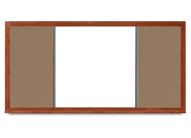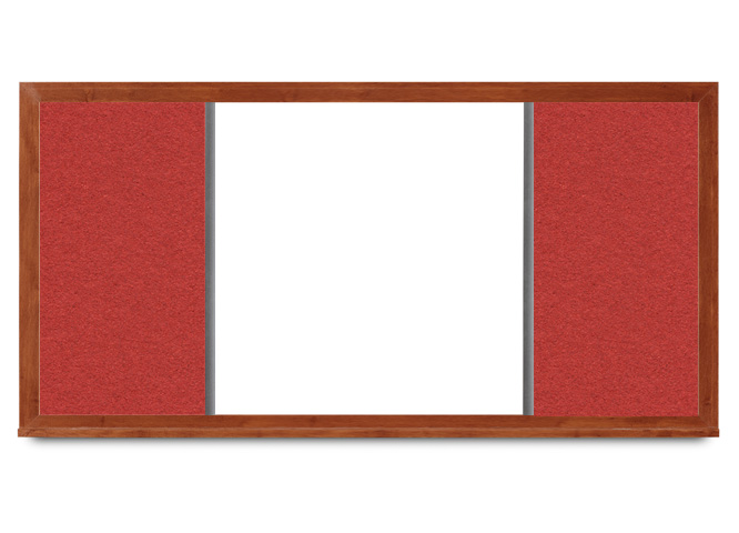 Magnetic whiteboard with non-staining dry erase surface and cork panels on both sides; wide cherry frame. See the chart in the gallery to the left for cork:whiteboard dimensions for each size board of this style.