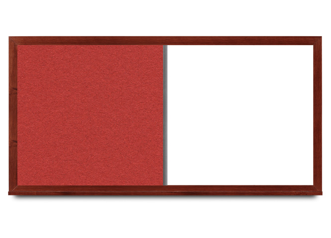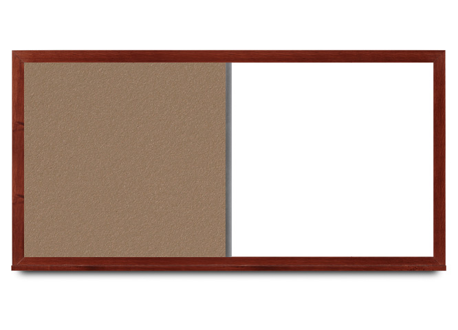 Whiteboards with high-density cork panel on left or right side, magnetic dry erase surface that won’t stain, and wide mahogany wood frame. See the chart in the gallery to the left for cork:whiteboard dimensions for each size board of this style.