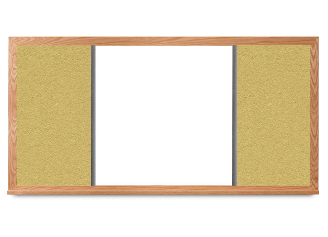 Magnetic dry erase whiteboard surface with cork panels on both sides; cork available in 15 colors. Wide oak frame. Click on the chart in the gallery to the left to see the cork:whiteboard dimensions for each size.