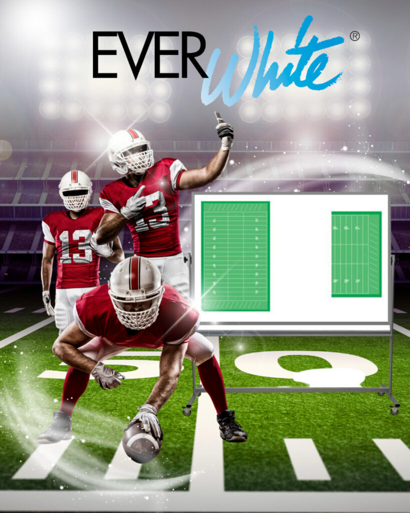In these spaces, wall-mounted coaching boards become part of the room itself. EVERWhite offers preprinted boards featuring football fields, basketball courts, soccer fields, hockey rinks, and volleyball courts, available in 3×4 and 4×6 sizes.